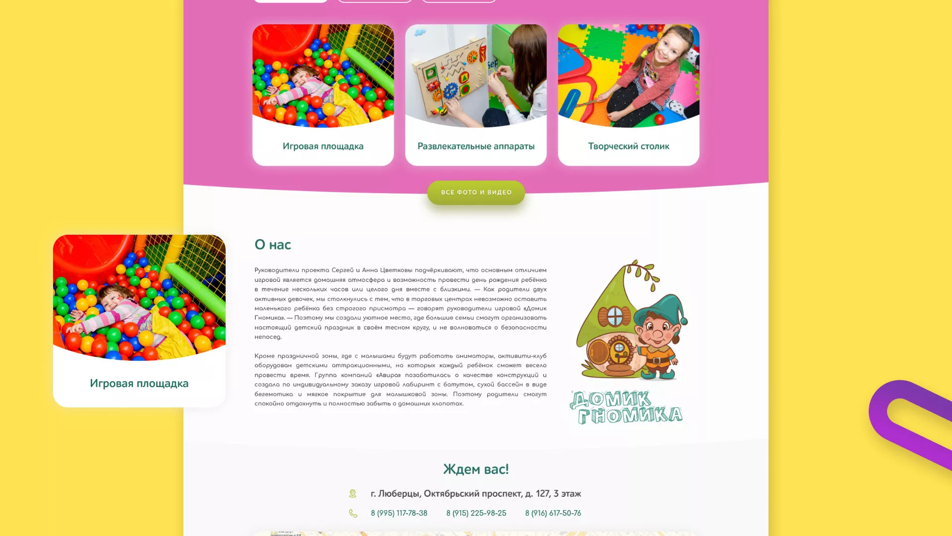 — Как родители двух активных девочек, мы столкнулись с тем, что в торговых центрах невозможно оставить маленького ребёнка без строгого присмотра — говорят руководители игровой «Домик Гномика» в Товарково.