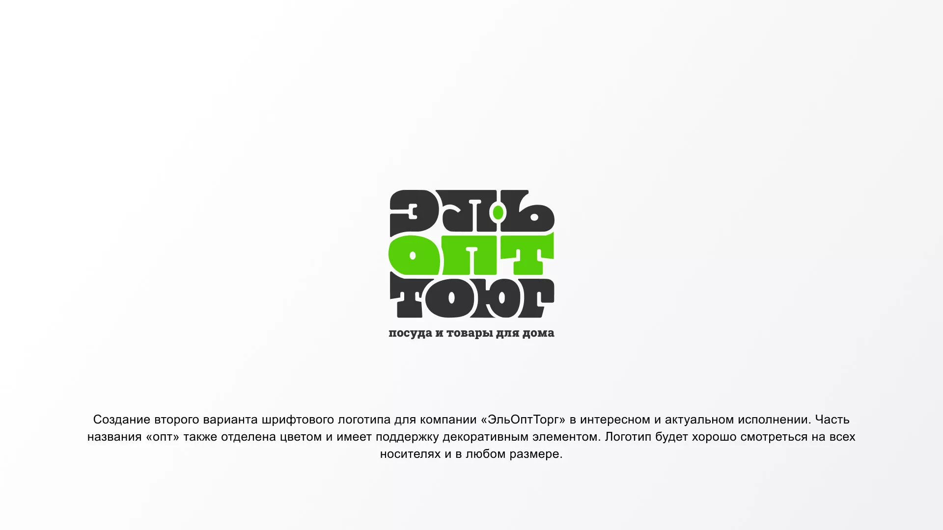 Создание второго варианта шрифтового логотипа в Товарково для компании «ЭльОптТорг» в интересном и актуальном исполнении. Часть названия «опт» также отделена цветом и имеет поддержку декоративным элементом. Логотип будет хорошо смотреться на всех носителях и в любом размере.